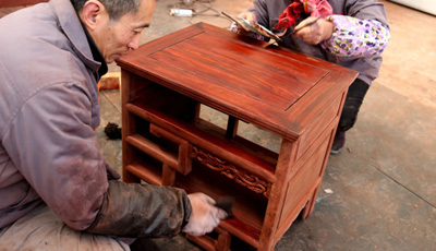 鴻豐軒紅木家具是以手工制作為主的,而且制作工序非常繁瑣,需要的周期比較長。它從原木到成品需要很多道工序,按工藝流程分為:干燥板材、木工工序、雕刻工序、打磨工序、組裝工序和上蠟工序,每一個工序里又有若干個小的制作工藝。